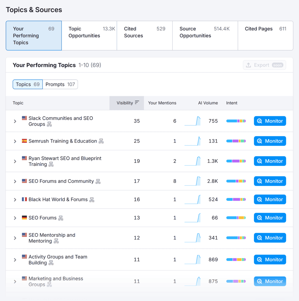 Next, scroll to the “Topics & Sources” report to learn which topics your brand appears in AI responses for and which ones it doesn’t.
