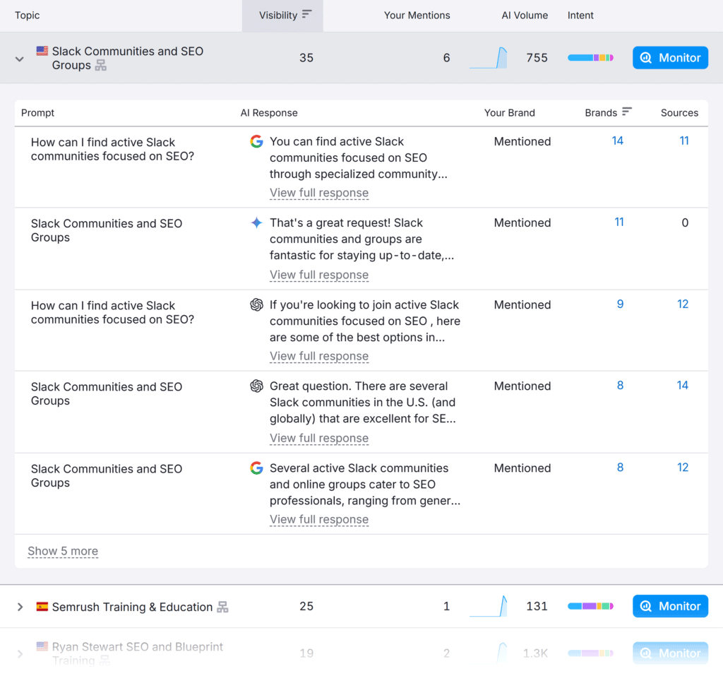 Review the “Sources” column, focusing on prompts that mention your brand. Look at which external sources AI platforms used when citing or recommending your brand.