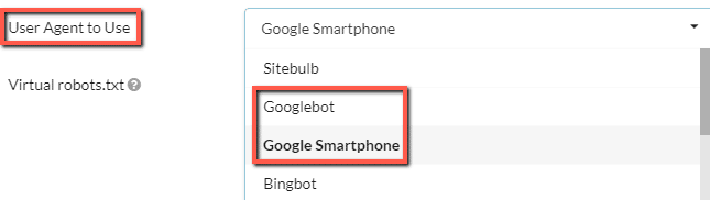 For your first audit, you’ll want to crawl with regular/desktop Googlebot, and then for your second audit, switch over to Googlebot Smartphone. All crawlers allow you to easily adjust the User Agent: