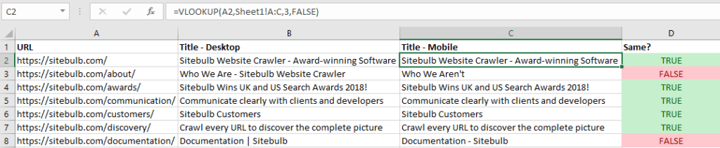Beyond the wider trends, you will also want to check that the data itself is the same. So, not just that a page title was found, but that the page title is the same on each page for desktop on mobile.